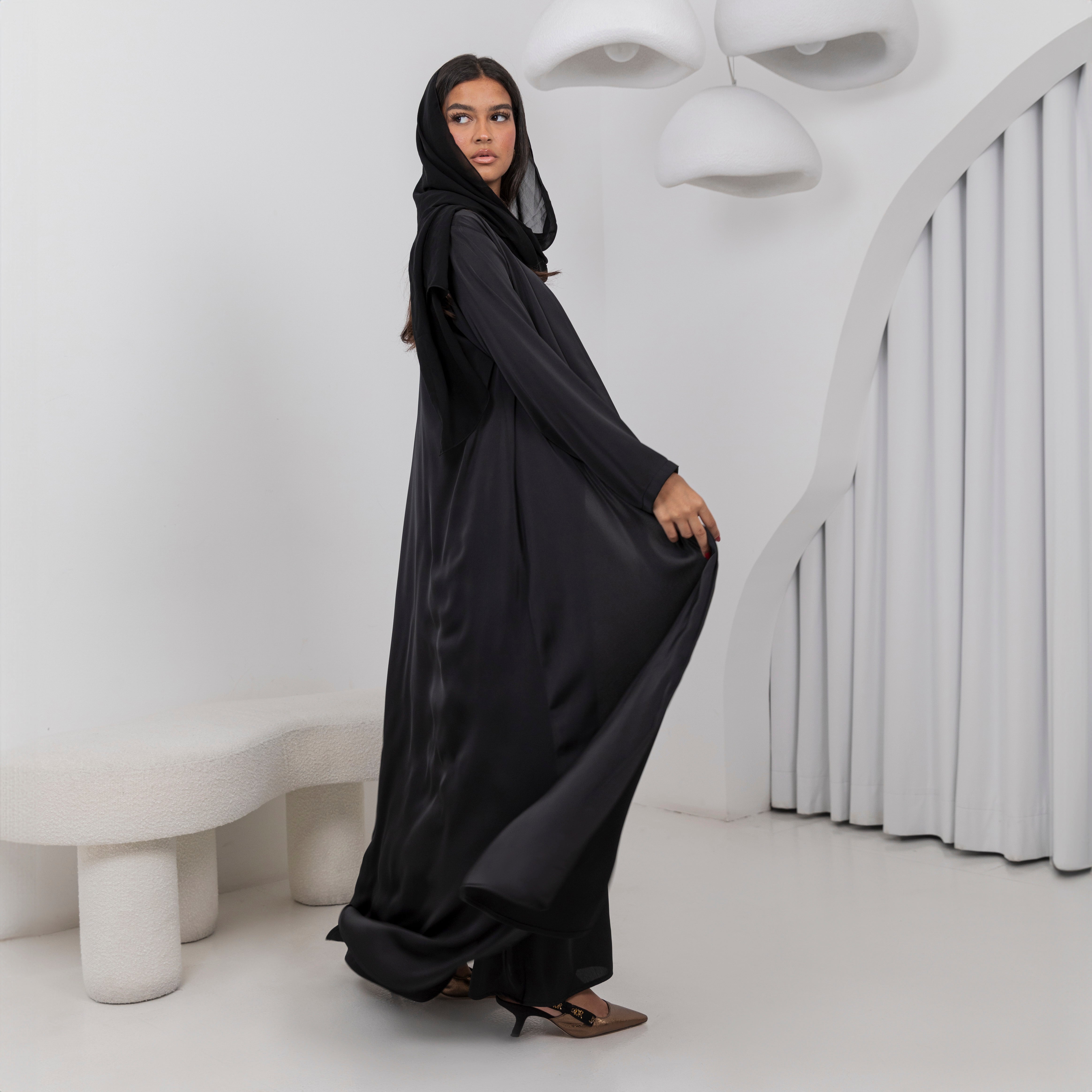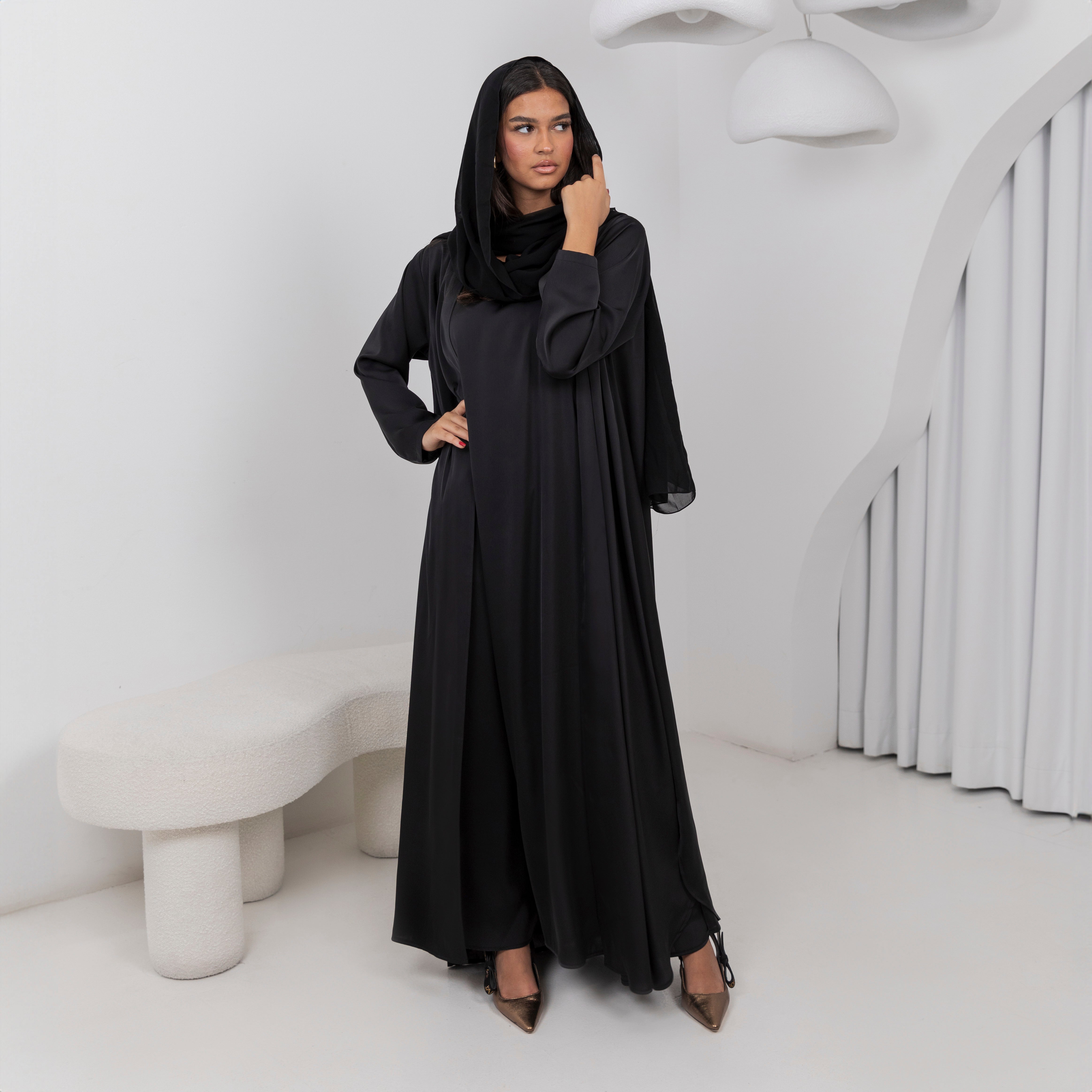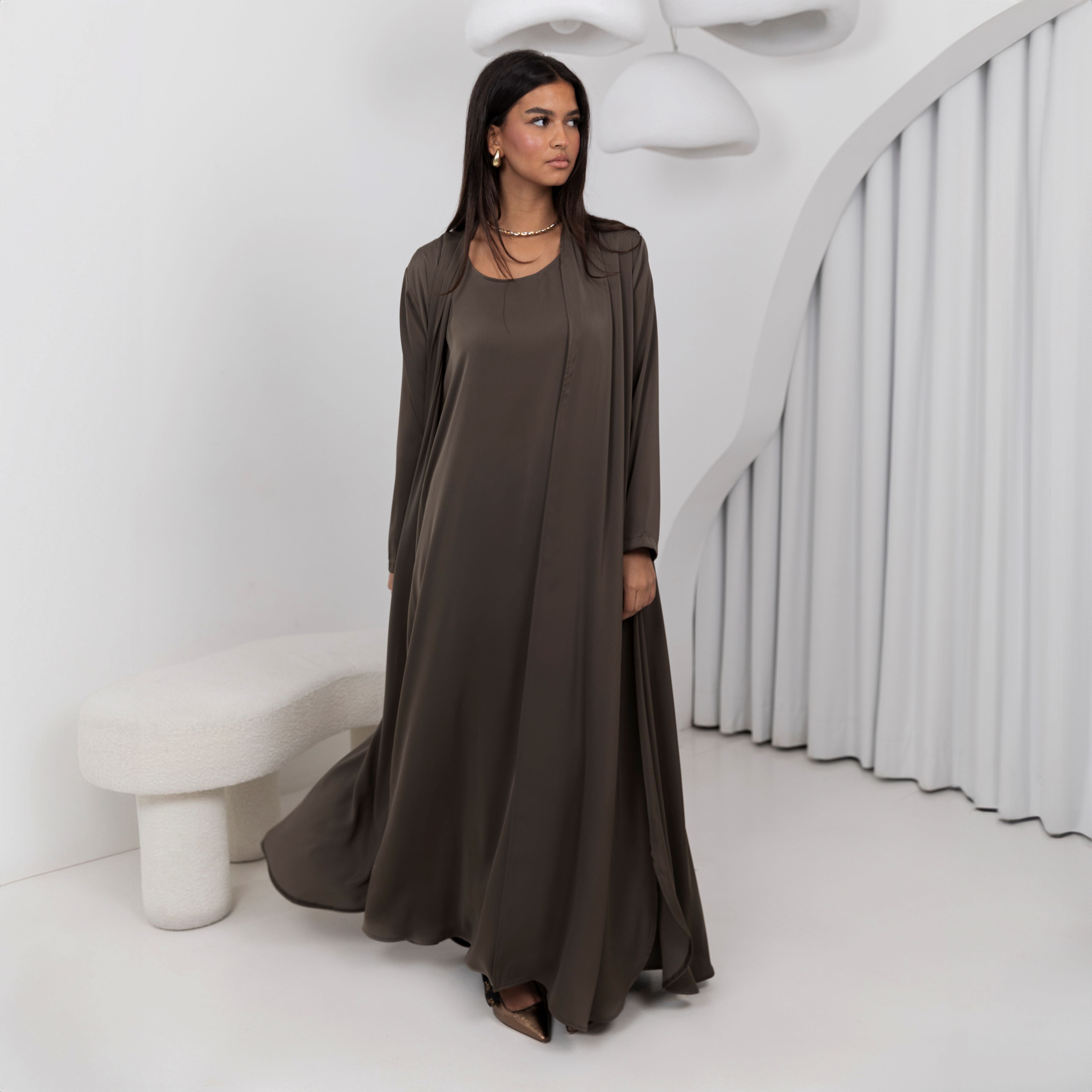 The Onyx set made of almost butter cream fabric that is cold, soft and everything breezy. Simple and elegant silhouette which embraces modest fashion. Available in Brown Grey color. SHEILA NOT INCLUDED